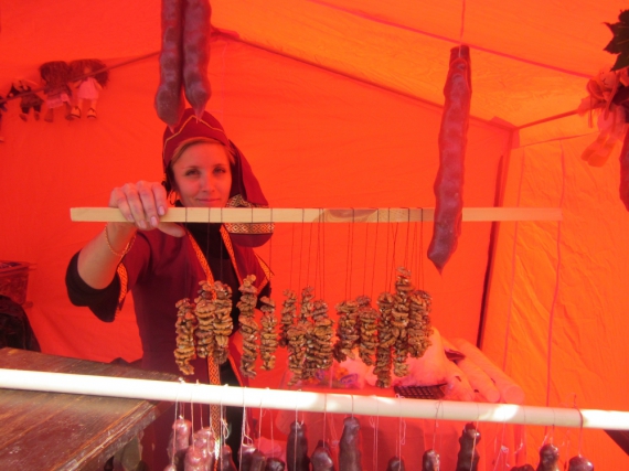"На ниточку нанизывается орех, затем вываривается вино и погружаются в него орехи. Ниточка стоит 20 гривен" - объясняют девушки-украинки в грузинском наряде, которые продают лакомство. Абхазури - свинина с телятиной - стоит 10 гривен, хачапури - 15.