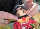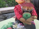 46-летняя кукольщица Оксана Воропай продает куклы грузинской мастерицы Лали Топурии. Куклы из ткани, высотой 20 сантиметров. Стоят 200 гривен. Большая полуметровая кукла-мужчина с бутылкой вина в руках - 250. Пробка бутылки - в виде грузинского сельского домика.