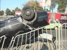 Хотя забор и немного сдержал Skoda, авто не остановилось. От удара Skoda перевернулась вверх колесами и упала на Opel, который стоял перед светофором. В этом экстремальном боевике, к счастью, практически никто не пострадал.