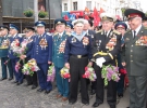 Впереди колонны марширующих военных в синей форме. За ними около 50 ветеранов с медалями на груди. Между ними винничанин Анатолий Биланин держит портрет советского вождя Иосифа Сталина.