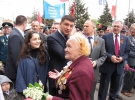 Старейшую ветеранку 90-летнюю Ольгу Твердохлебову приводят под руки губернатор Николай Джига и председатель облсовета Сергей Татусяк.