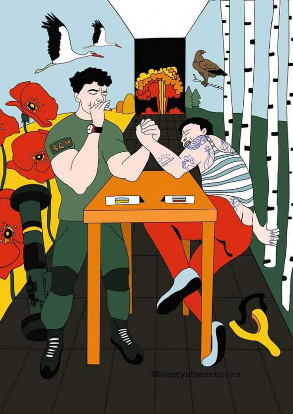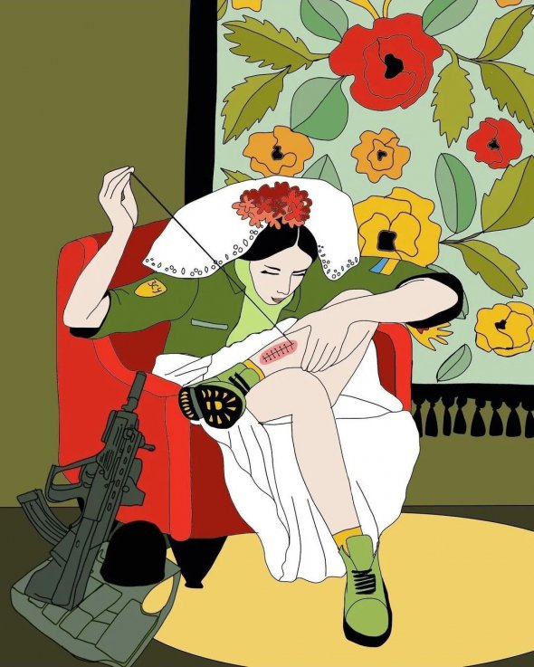 "У меня многие друзья защищают Украину. Они служат в ВСУ. Я с ними переписываюсь, волонтерю, помогаю, знаю, как они борются. Вижу, как они преобладают не только физически, но и духовно над нашим врагом. Я хотела отразить в иллюстрации образ Украины и образ России, насколько они отличаются. Насколько наша страна мужественна и красива снаружи и внутренне, и насколько Россия убогая и нищая.
