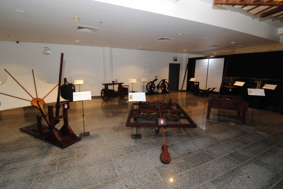 На ней представлено 200 экспонатов, которые изобрел и создал Леонардо да Винчи. Чтобы сделать для выставки изобретенные художником машины итальянские эксперты в течении десяти лет изучали толкование дневников да Винчи. Да Винчи придумывал планер, парашют, вертолет, велосипед, прототип современного танка, пулемет, автомобиль, подводная лодка, подшипник. Организаторы выставки отмечают, что да Винчи придумал 120 механизмов. Представленные макеты из дерева, меди и железа изготовлены в натуральную величину. Некоторые даже можно испытать в действии. Большинство спроектированных да Винчи конструкций так и не воплотили при жизни автора.