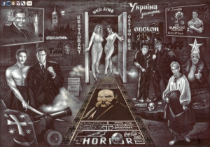 "Рисовал 2,5 месяца, - говорит художник. - Показал Украину согласно стереотипам, существующих в отношении нашего государства среди иностранцев. В этой картине есть положительные герои. Например, братья Кличко. Один из них в виде казака, как символ возрождения казацких традиций. Показал их, как надежду на лучшее будущее, возрождение. Сначала нарисовал ворота, которые открывают обнаженные девушки. Потом была Тимошенко. Остальные образы приходили постепенно".