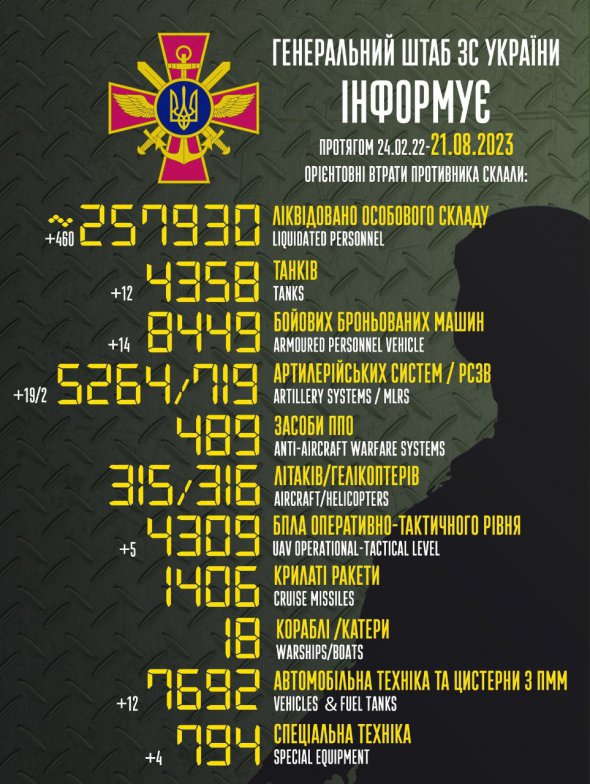 Общие боевые потери России на утро 21 августа составляют уже более 257 930 оккупантов.