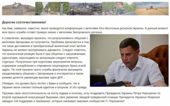 На главной странице сайта было размещено обращение, в котором Захарченко признается в своей несостоятельности и рассказывает, что на "прямой линии" с Запорожской областью ему задали очень много вопросов с оскорблениями в нецензурной форме.