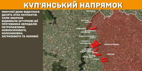 На Купянском направлении за прошедшие сутки произошло десять атак окупантов. Силы обороны отражали штурмовые действия противника неподалеку от Петропавловки, Новоосинового, Колесниковки, Загрызового и Лозовой.