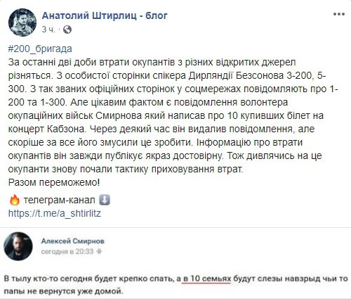 "За последние 2 суток потери оккупантов из разных открытых источников разнятся. С личной страницы спикера "дырляндии" Бессонова - 3 - 200, 5 - 300. С так называемых официальных страниц в соцсетях сообщают о 1 - 200 и 1 - 300. Но интересным фактом есть сообщения волонтера оккупационных войск Смирнова, который написал о 10 купивших билет на концерт Кобзона. Через некоторое время он удалил сообщение, но, скорее всего, его заставили это сделать. Информацию о потерях оккупантов он всегда публикует как раз достоверную. Значит, оккупанты снова начали тактику скрытия потерь. Вместе победим!" - написал Штефан.