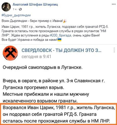"Воин" Дирляндии "- бери пример с Ивана. Иван Царик, 1981 г.р., житель Луганска, подорвал себя гранатой РГД-5. Граната осталась после прохождения службы в рядах оккупантов "НМ ЛНР". Ждем вступления в ряды "200_бригада" очень ждем Ваня ", - добавил Штефан.
