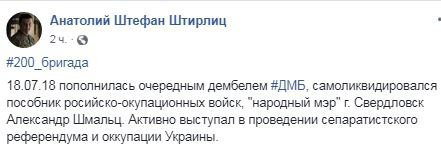 "200-я бригада" (погибшие на Донбассе боевики) 18.07.18 пополнилась очередным "дембелем" - самоликвидировался сторонник российско-оккупационных войск, "народный мэр" города Свердловск Александр Шмальц. Активно выступал в проведении сепаратистского референдума и оккупации Украины", - написал "Штирлиц".