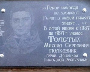 В оккупированном Иловайске на стену школы №15, где с 1987 года учился Михаил Толстых (Гиви), повесили гранитную доску с его портретом. На церемонии присутствовали боевики из батальона террористов "Спарта" и сестра убитого Гиви.