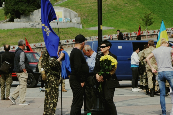 "В субботу (12 июня - ред.) погибли четверо правосеков. А мы не называем это войной. Бедные матери", - садится под стелу брюнетка в черных очках, разговаривая по телефону. Держит букет из маков.