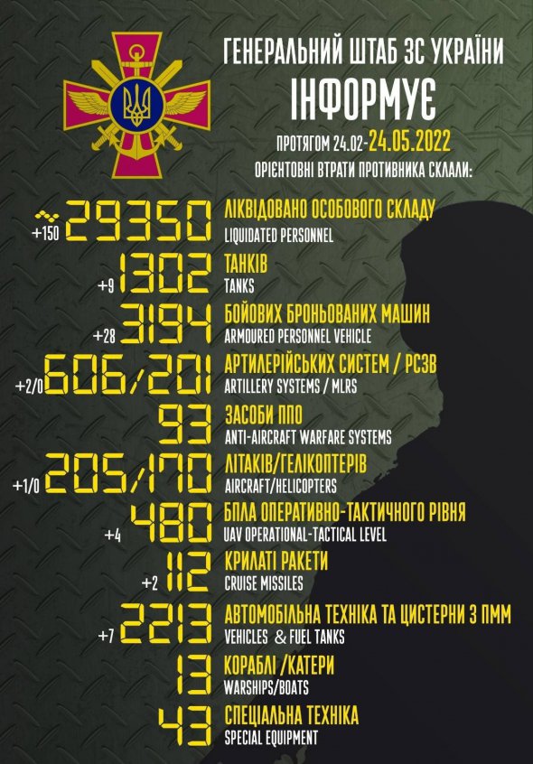 Потери российских захватчиков в Украине на 24 мая составляют 29 350 человек.