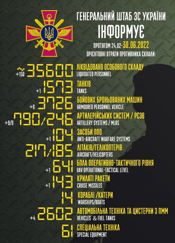 Потери российских оккупантов в Украине 30 июня составляют 35,6 тыс. человек.