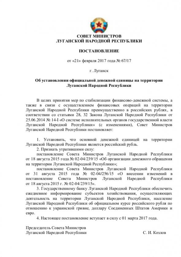 С 1 марта основной денежной единицей в ЛНР станет российский рубль.