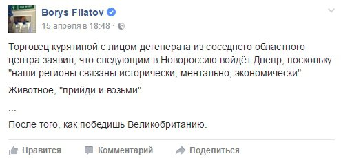 "Торговец курятиной с лицом дегенерата из соседнего областного центра заявил, что следующим в "Новороссию" войдет Днипро, поскольку "наши регионы связаны исторически, ментально, экономически". Животное, "приди и возьми". После того, как победишь Великобританию", - написал Филатов.