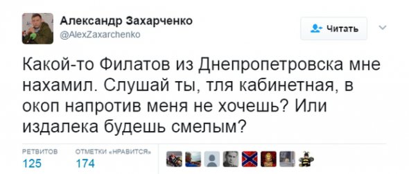 Захарченко решил, что Филатов его публично унизил и ответил мэру в Twitter. "Некий Филатов из Днепропетровска мне нахамил. Слушай ты, тля кабинетная, в окоп напротив меня не хочешь? Или издалека будешь смелым?" - написал он.