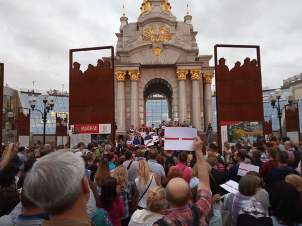 Кто-то включил колонки, из которых начали раздаваться песни, с которыми проходила Революция достоинства. Людей больше, они общаются между собой и теми, кто оперативно организовал эту акцию.