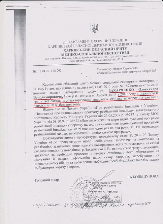 В этом же документе психиатры предупреждают, что действия Захарченко угрожают окружающим и по требованию прокуратуры назначают принудительную диспансеризацию больного в Харьковскою областную клиническую психбольницу №3.