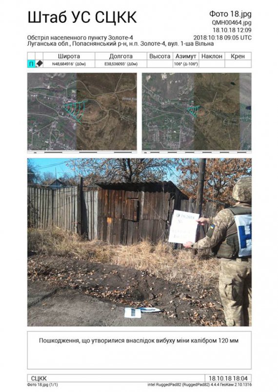 "В отчете СММ ОБСЕ за 16 октября 2018-го была опубликована информация об обстреле населенного пункта Золотое-4, который осуществлялся с применением запрещенного Минскими соглашениями оружия. Обстрел велся 13 октября 2018-го около 18.00 по направлению с оккупированного вооруженными формированиями РФ Золотого-5 с применением 120 мм минометов", - говорится в сообщении.