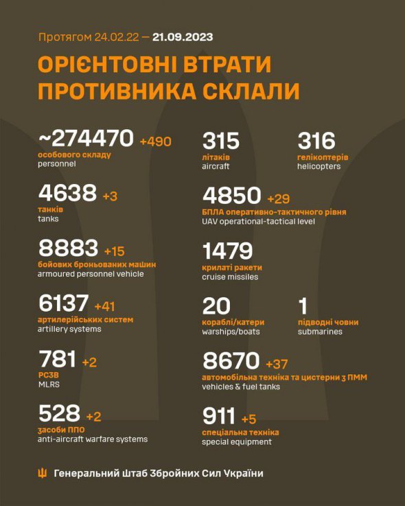 Общие боевые потери России на утро 21 сентября составляют уже более 274 470 оккупантов.