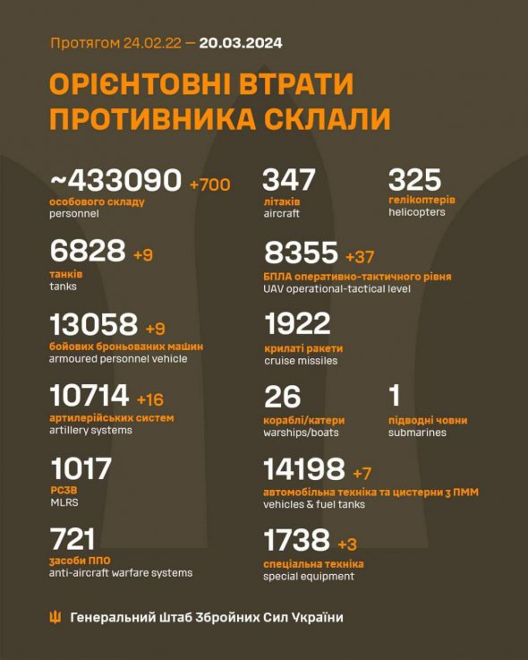 Общие боевые потери российских оккупантов на утро 20 марта составили 433 090 человек.