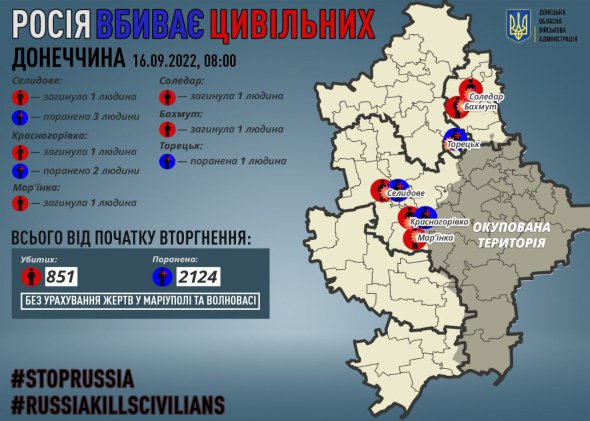 С начала полномасштабного вторжения террористы убили 851 жителя Донецкой области, еще 2124 человека получили ранения от рук захватчиков.