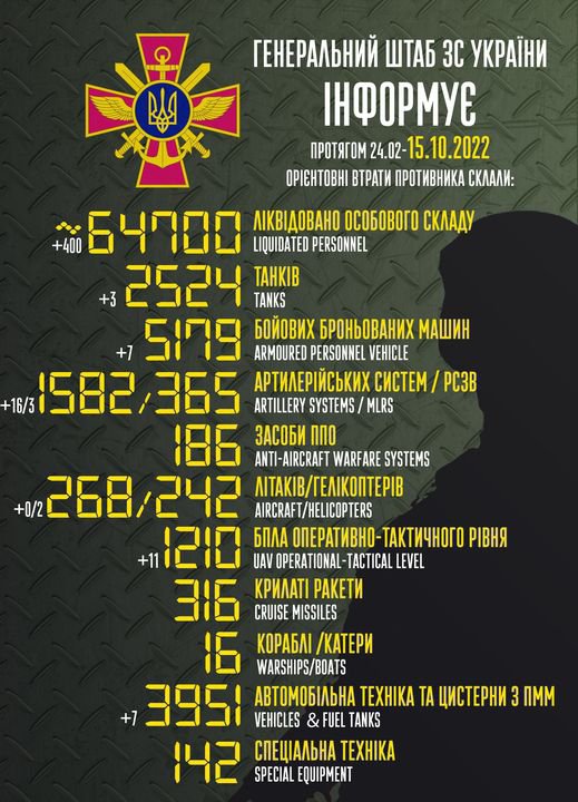 Общие боевые потери России на утро 15 октября составляют 64,7 тыс. человек.