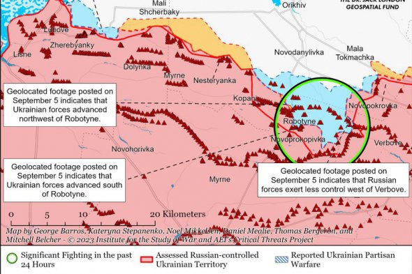 Дополнительные геолокационные кадры от 5 сентября показывают, что украинские силы также продвинулись к югу от Роботино и к северо-западу от Ивового, что примерно в 10 км к востоку от Роботино.