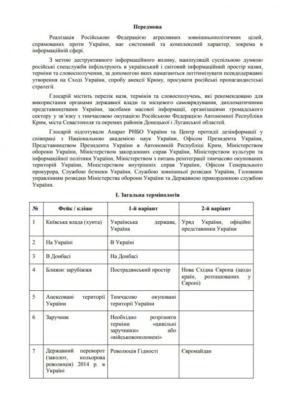 Совет национальной безопасности и обороны опубликовал 20 октября глоссарий терминов, который рекомендуют использовать в отношении российской агрессии. Его разработали для противодействия пропаганде.