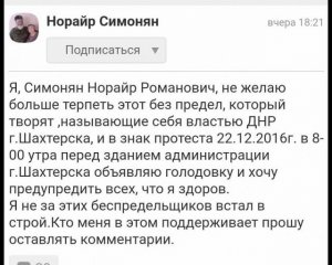 Сторонник ДНР с Шахтерска Норайр Симонян заявил о голодовке.