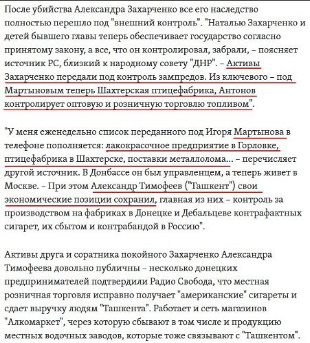 "После убийства Александра Захарченко вся его наследие полностью перешла под" внешний контроль ". Наталью Захарченко и детей бывшего главы теперь обеспечивает государство согласно принятому закону. А все, что он контролировал, забрали. Активы Захарченко передали под контроль заместителей председателя. С ключевого - под Мартыновым (бывший "мэр" оккупированного Донецка Игорь Мартынов) теперь Шахтерская птицефабрика, Антонов ( "министр соцполитики" т.н. ДНР Владимир Антонов) контролирует оптовую и розничную торговлю топливом ", - говорится в материале.