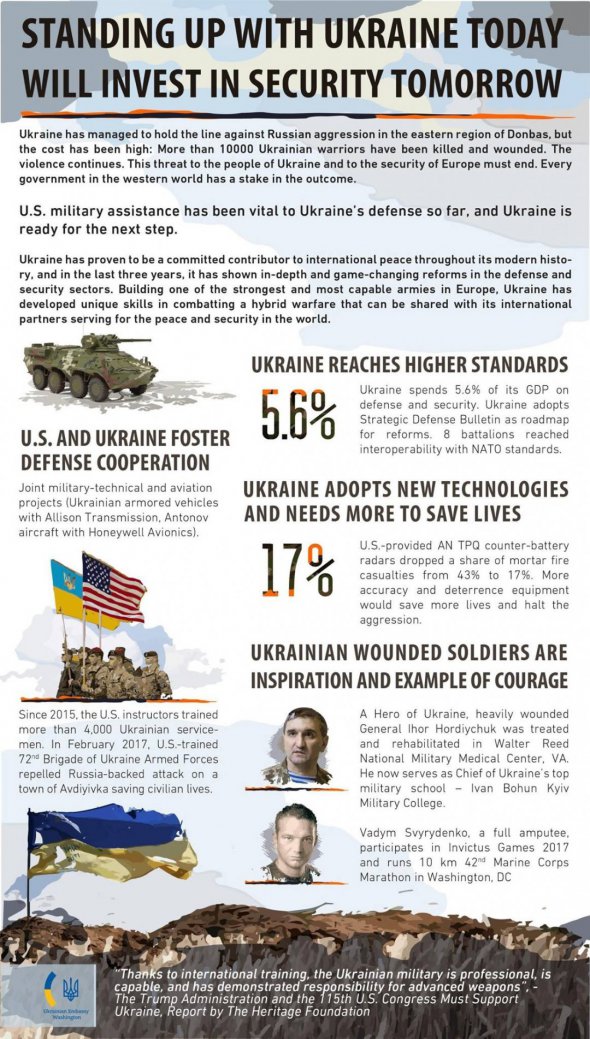 Сейчас Украина тратит 5,6% ВВП на безопасность и оборону. Восемь украинских батальонов достигли совместных с НАТО стандартов; Соединенные Штаты поставили контрбатарейная радары; американские инструкторы провели тренинги для более 4 тыс. украинских военнослужащих - и это позволило сохранить многие жизни в Украине.