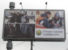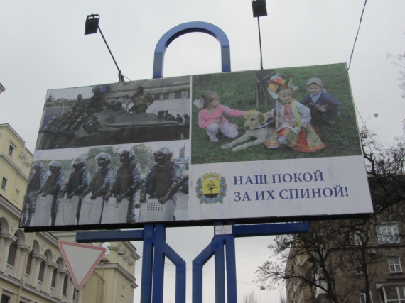 В пятницу в Донецке появились баннеры, восхваляющие "Беркут". "Наш покой за их спиной" - значится в рекламе, расположенной возле оперного театра. "Страну собою защищаем" - написано на баннере по проспекту Ленинскому.