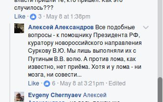 "Все подобные вопросы - к помощнику президента РФ, куратора новороссийского направления Суркову В.Ю. Мы только выполняли их с Путиным В.В. волю. А против лома, как известно, нет приема. Хотя и у лома - нет мозгов, ни совести ... ", - написал Александров в ответ на вопрос, почему террористами ДНР сейчас руководит Захарченко.