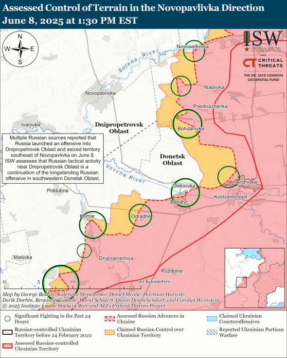 В то же время, в ISW не выявили геолокационных доказательств этих заявленных продвижений вблизи границы Днепропетровской области. Эксперты проанализировали спутниковые снимки за 7 и 8 июня, на которых были отмечены новые воронки от артиллерии.