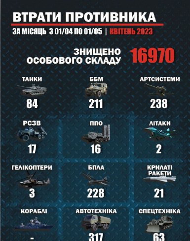В течение апреля украинские военные ликвидировали 16 970 российских оккупантов.