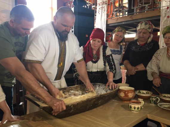 Василий в вышиванке под указания женщин в национальных костюмах замесил тесто. Куличи с сине-желтой глазурью поедут на передовую к бойцам.