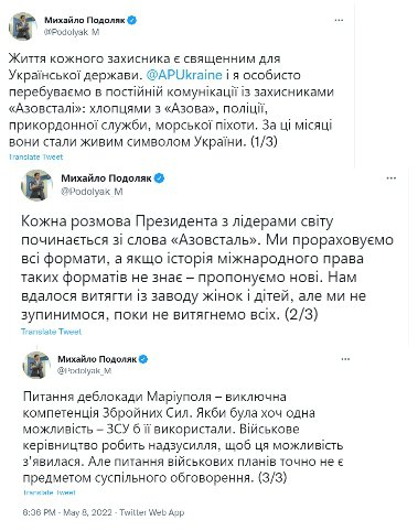 "Защитники Азовстали - ребята из "Азова", полиции, пограничной службы, военные - стали живым символом Украины. Мы делаем все, чтобы их спасти. На мой взгляд, энергия общества сегодня должна быть направлена не на обращение к военно-политическому руководству внутри страны, потому что мы максимально сосредоточены на поиске решений, а на общества западных стран, мировых лидеров и международных организаций.