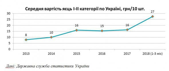 В Украине в марте 2018 года яйца по сравнению с аналогичным периодом 2013 года подорожали в 6 раз. Цена выросла с 5 до 27 грн за десяток.
