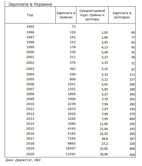 Гривну ввели в оборот только 1996 года, поэтому корректно сравнить зарплату в долларах можно только с этого года.