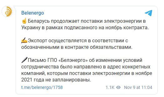 8 ноября в СМИ появилась информация о том, что Беларусь якобы отказалась продавать электроэнергию Украине, в связи с чем поставки в ноябре осуществлять не будут. Данные получили из письма "Белэнерго" к участникам энергорынка. Такое письмо получили несколько участников рынка, в том числе украинский государственный "Энергоатом".