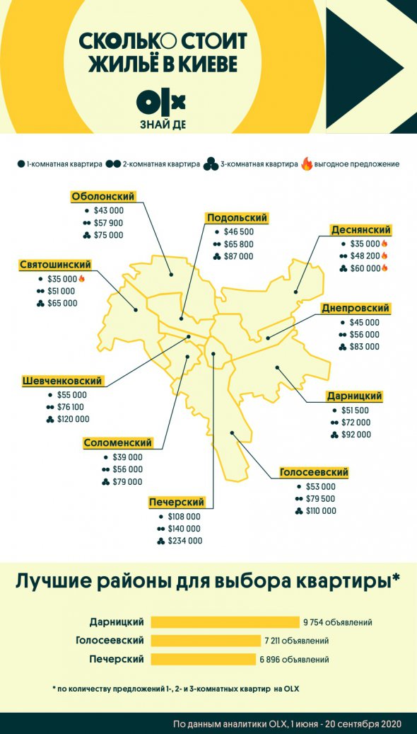 В спальном Оболонском районе приобрести однокомнатную квартиру в среднем стоит $43 тыс. В Днепровском - $45 тыс. Это на 13% больше, чем в прошлом году. В то же время за год количество объявлений о продаже существенно выросло. В Подольском районе за однокомнатное жилье надо заплатить $46,5 тыс, в Дарницком - $51,5 тыс. Правда 2019-го просили $40,4 тыс.