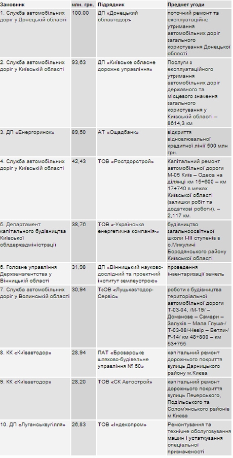 В топ-10 закупок средства выделены на текущий, капитальный ремонт и эксплуатационное содержание автомобильных дорог на сумму более 300 млн. гривен, строительство школы на Киевщине стоимостью 38 млн., и ремонт машин и оборудования спецназначения на ГП "Луганскуголь".