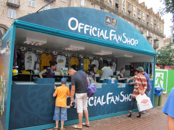 В официальном магазине сувениров и одежды "Евро 2012" на столичном Крещатике людно. За 200 грн или 20 евро здесь можно приобрести футболку или шарф. На 120-150 грн - футбольный мяч.