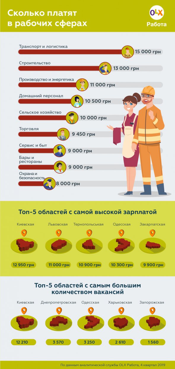 Строители в среднем получали 13 000 грн. Правда во Львовской области платили больше всего - 17 500 грн. В Киевской, Закарпатской, Тернопольской и Хмельницкой областях - 15 000 грн, передает Olx.ua.