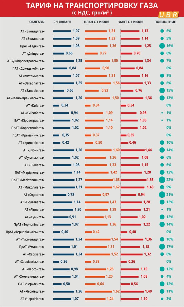 Совсем не изменится тариф в платежках у клиентов Донецкоблгаза, Киевгаза, Коростишевгаза, Кременчуггаза, Тернопольгоргаза и Харьковгоргаза, а стоимость услуг Киевоблгаза, Кировоградгаза, Ровногаза символично повысится на 1%. Однако существенно подорожают в июле платежки для украинцев, которым доставляют голубое топливо Мелитопольгаз (22%), Одессагаз (21%), Уманьгаз (17%), Гадячгаз (16%), Запорожгаз (15%).
