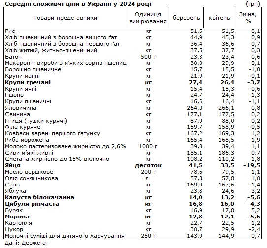 "В апреле средние цены на яйца упали на 19,5% до 33,5 гривен за десяток. Крупы гречневые подешевели на 3,7% до 26,4 гривен за килограмм. Капуста подешевела на 5,6% до 13,2 гривен за килограмм, а морковь - на 5,6% до 12,1 гривен за килограмм. Лук подешевел на 4,3% до 16,0 гривен за килограмм", - сказано в сообщении.