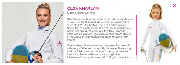 В этом году куклу Барби посвятили украинской олимпийской чемпионке Ольге Харлан. Кукла-фехтовальщица - часть серии Role Models, которую начали выпускать два года назад к 60-й годовщине существования бренда.