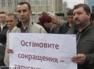 6 апреля недалеко от заводской проходной протестовали попавшие под сокращение рабочие Донецкого электрометаллургического завода. В акции приняли участие чуть больше ста человек. Они держали плакаты: "Остановите сокращения", "Дайте возможность работать и кормить семьи", "Дайте доработать до пенсии", "Хотим работать".